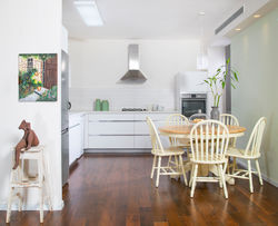 בשונה מחדרי הרחצה, חיממה ליאת את חלל המגורים המטבח ופינת האוכל ברצפת עץ חמימה המעניקה תחושה נעימה בכל ימות השנה ומקפיצה את הצבעים הבהירים בחלל, אך ללא ספק שמרה על אחידות בנגיעות הוינטאג' המאוד עדינות, כמו קיר פינת האוכל הירקרק אל מול הריהוט המגוון, הצבעים הטבעיים השתלבו היטב בדירה.