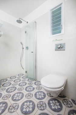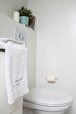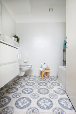 את חדרי הרחצה בדירה המתוקה הזו בכפר סבא בחרה ליאת סידס לעצב בסגנון וינטאג' במראה מיושן, מה שהיה קל לעשות עם אריחי רטרו בלו עיגולים 33/33 במראה אירופאי כפרי - הבחירה בצבעים הבהירים מקנה לחדרי הרחצה תחושת נקיון והגוון התכלת מעניק אווירה שלווה ונעימה.
